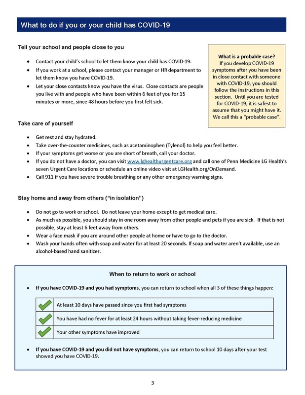 From the onset of the COVID-19 outbreak, Penn Medicine Lancaster General Health has brought together skilled professionals from all parts of their organization to collaborate on new protocols that ensure they can safely care for all patients—they are also here to be a resource for you. Below you will find information about safety protocols for Columbia Borough School District and staff. You can find the PDFs of English, Spanish, and Arabic on our "Covid-19 Updates" page, located here.