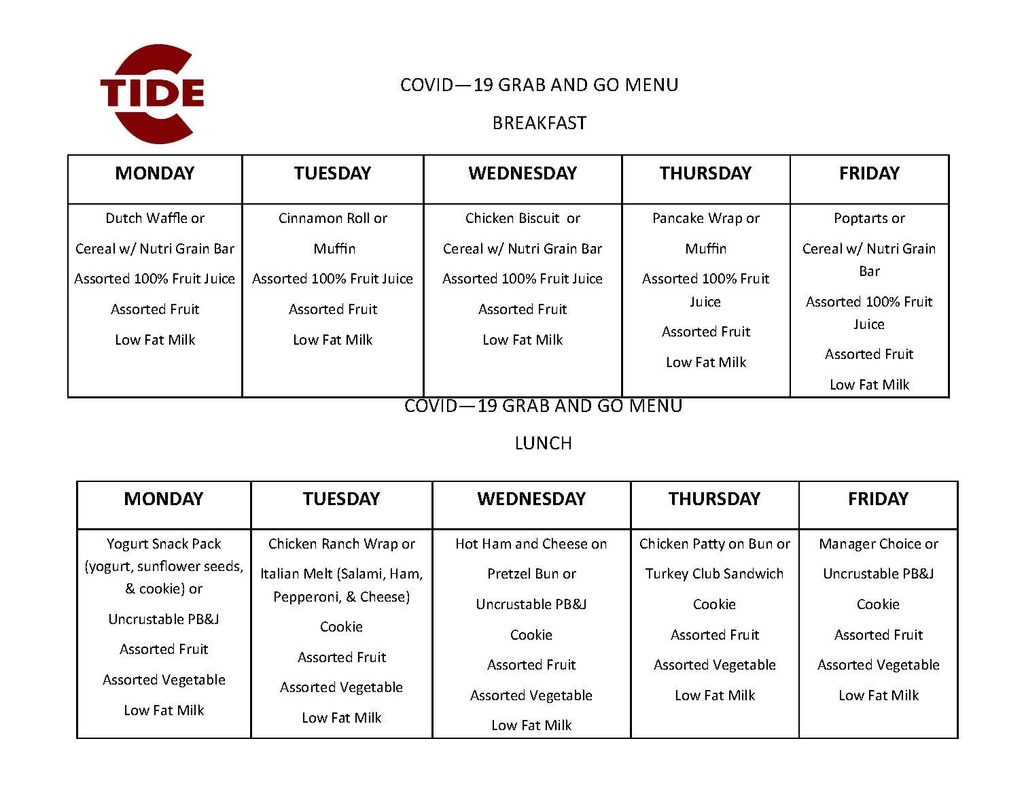 Grab and Go Breakfast and Lunch will only be served at Park Elementary School, same time 9:45 to 11am, everyday, Monday thru Friday.