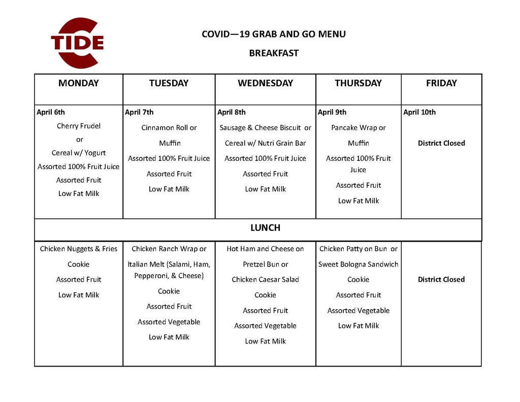 A Grab & Go breakfast and lunch will be available for every Columbia Borough School District student, Monday thru Friday beginning Monday, March 16, 2020
